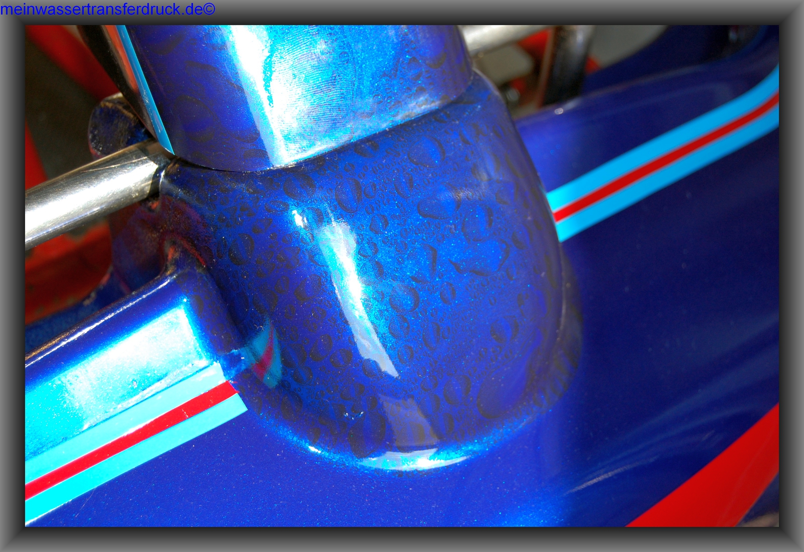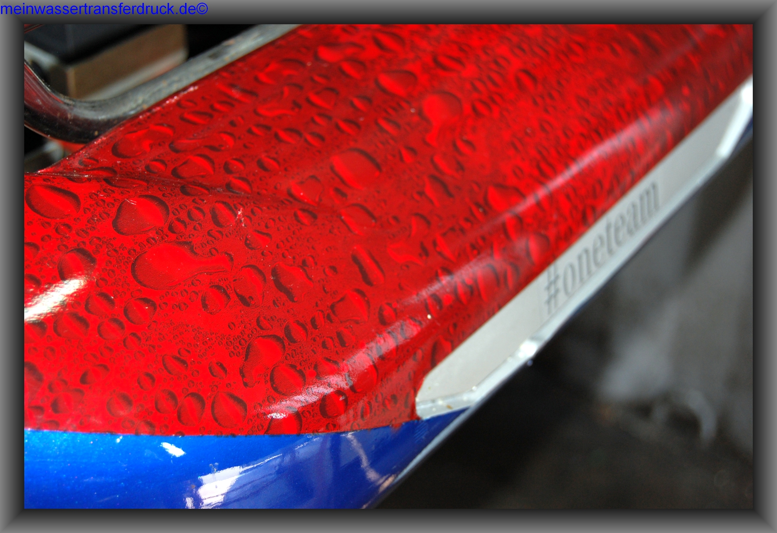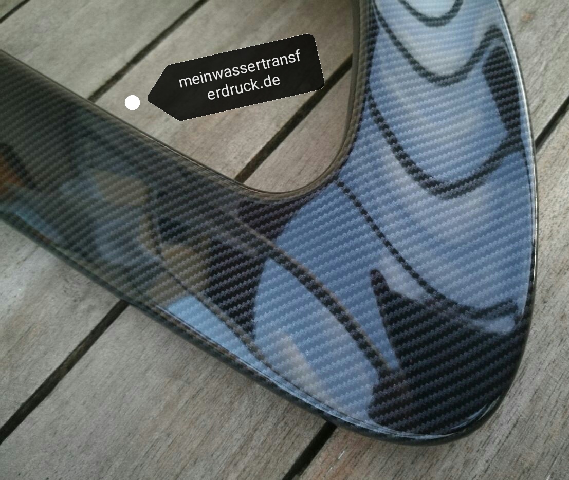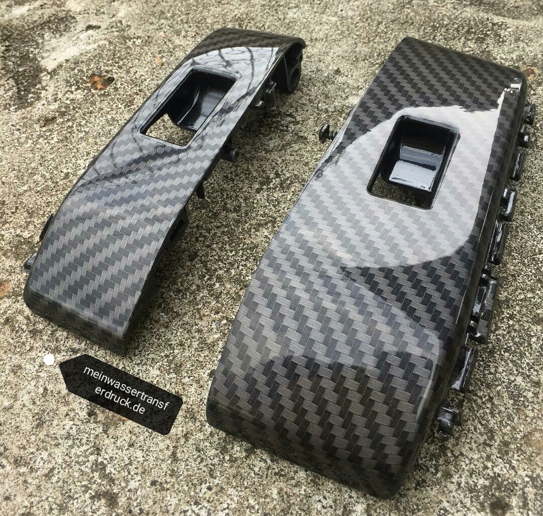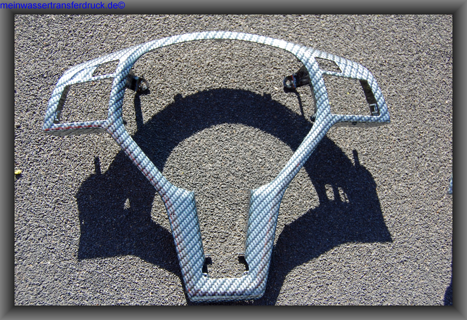 Das zu beschichtende Teil wird entsprechend vorbehandelt und mit einem Base-Coat entsprechend der ausgewählten Folie lackiert. Anschließend erfolgt der eigentliche Tauchvorgang. Hier wird die gewünschte Designfolie auf die Wasseroberfläche gelegt und nach einer definierten Zeit aktiviert, so dass dann anschließend Ihr Teil getaucht werden kann. Durch den Wasserdruck schmiegt sich der Dekorfilm gleichmäßig an das Teil. Nach dem Tauchvorgang wird es einer gründlichen Spülung unterzogen, so dass alle Folienreste entfernt sind. Nach einer Trocknungszeit bekommt Ihr Teil die Finishpolitur. Es wird in mehreren Schichten mit einem 2K-Klarlack lackiert und somit ist es geschützt und erstrahlt in Hochglanz in Ihrem neuen Design.