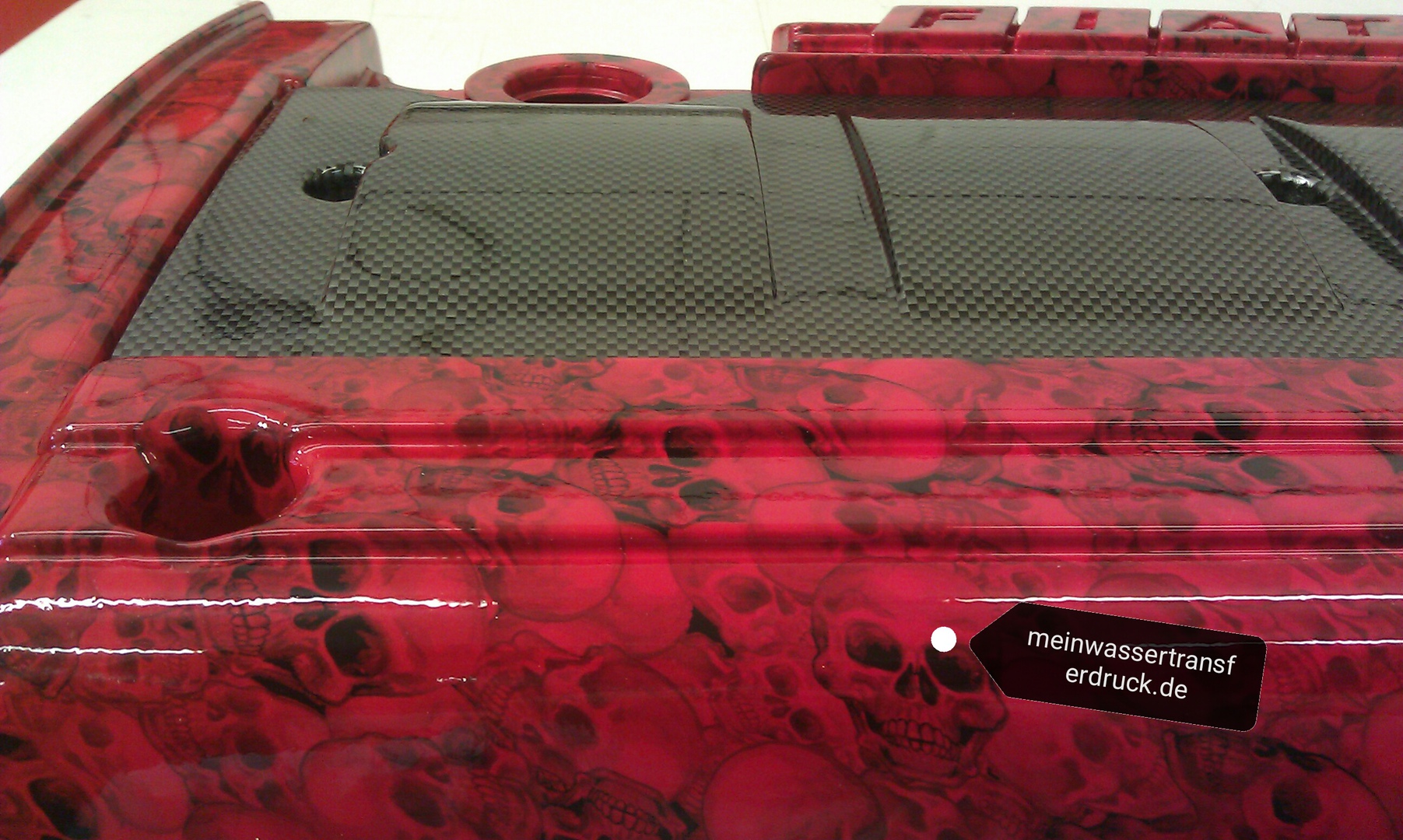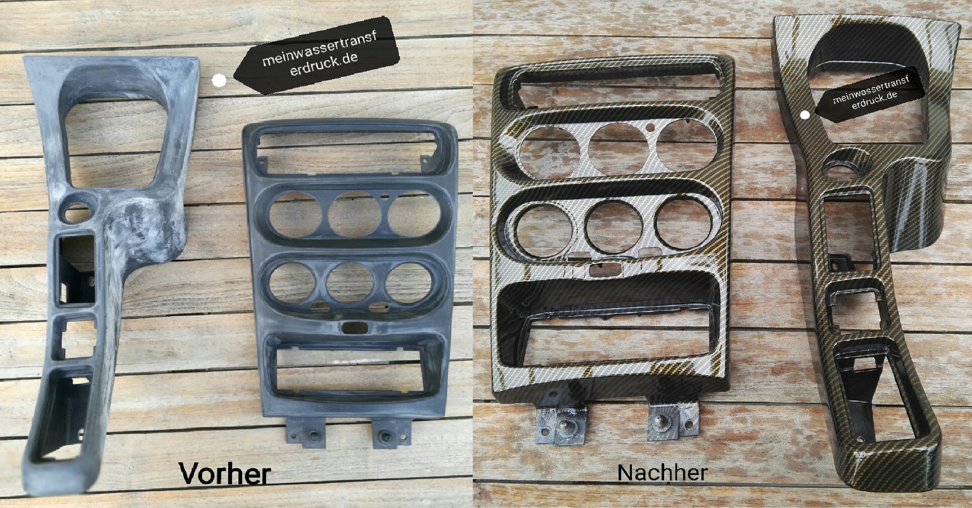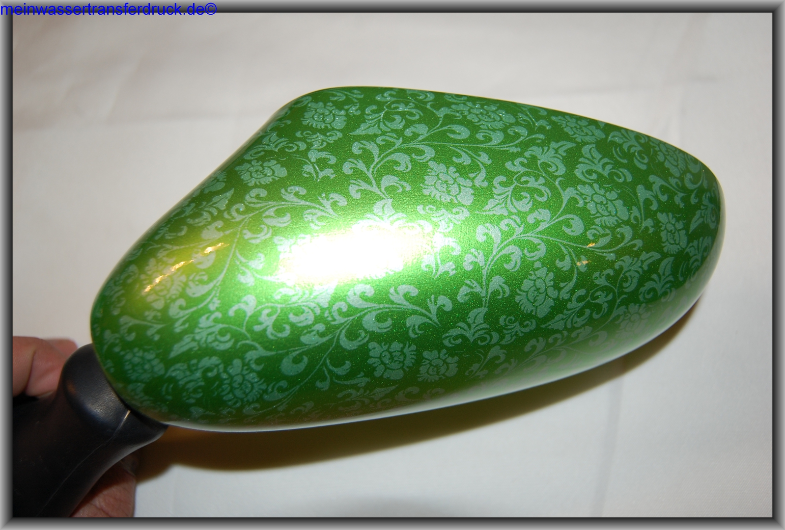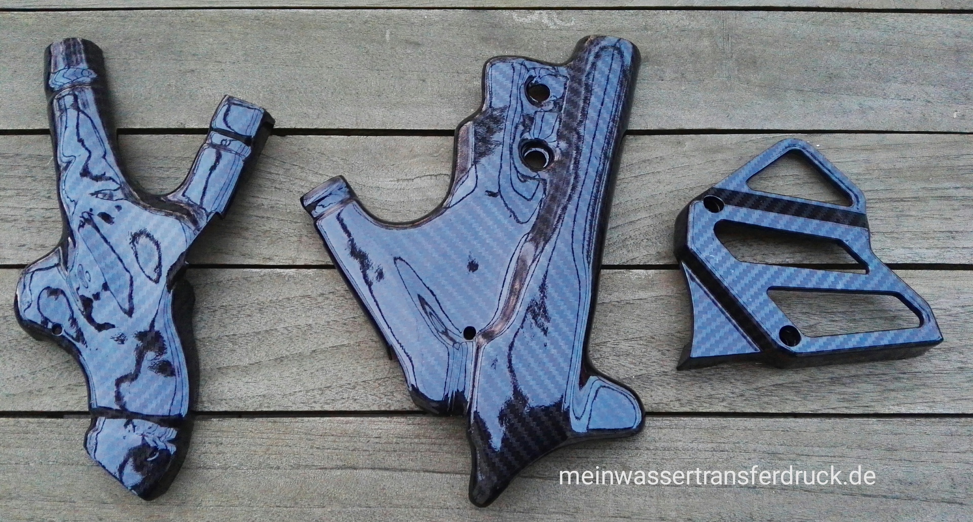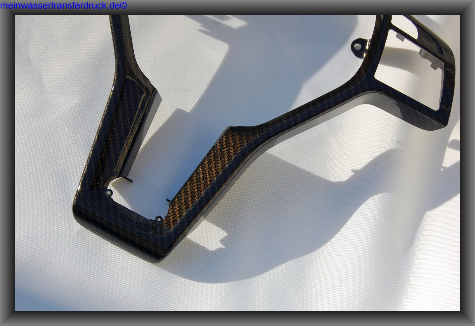 Das zu beschichtende Teil wird entsprechend vorbehandelt und mit einem Base-Coat entsprechend der ausgewählten Folie lackiert. Anschließend erfolgt der eigentliche Tauchvorgang. Hier wird die gewünschte Designfolie auf die Wasseroberfläche gelegt und nach einer definierten Zeit aktiviert, so dass dann anschließend Ihr Teil getaucht werden kann. Durch den Wasserdruck schmiegt sich der Dekorfilm gleichmäßig an das Teil. Nach dem Tauchvorgang wird es einer gründlichen Spülung unterzogen, so dass alle Folienreste entfernt sind. Nach einer Trocknungszeit bekommt Ihr Teil die Finishpolitur. Es wird in mehreren Schichten mit einem 2K-Klarlack lackiert und somit ist es geschützt und erstrahlt in Hochglanz in Ihrem neuen Design.