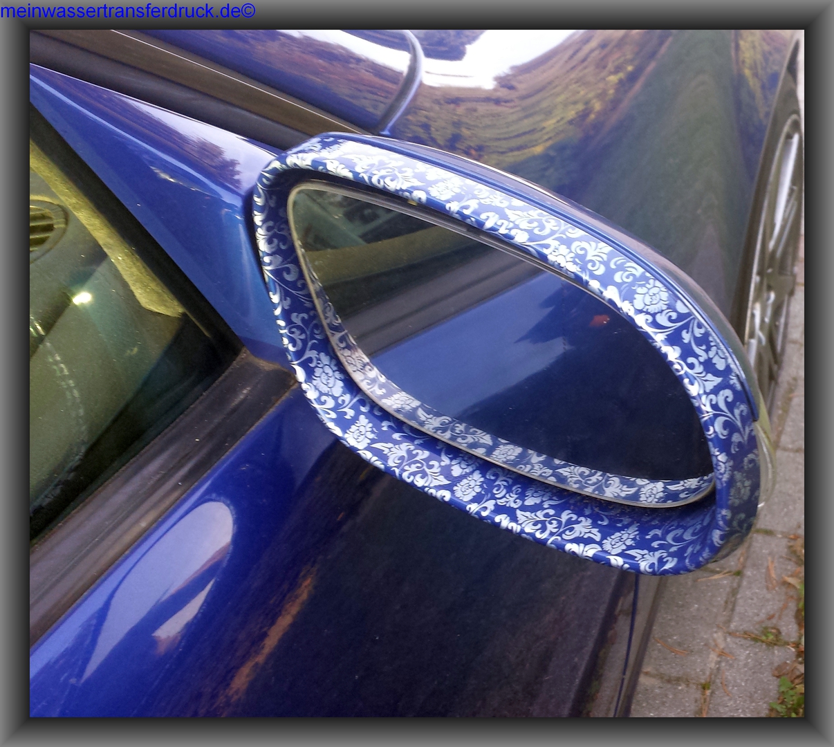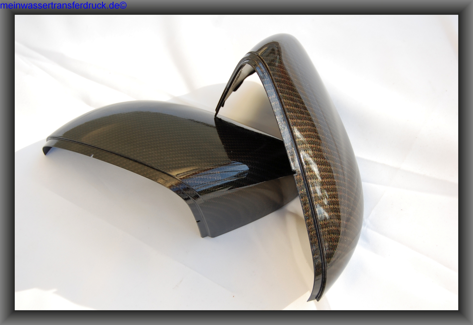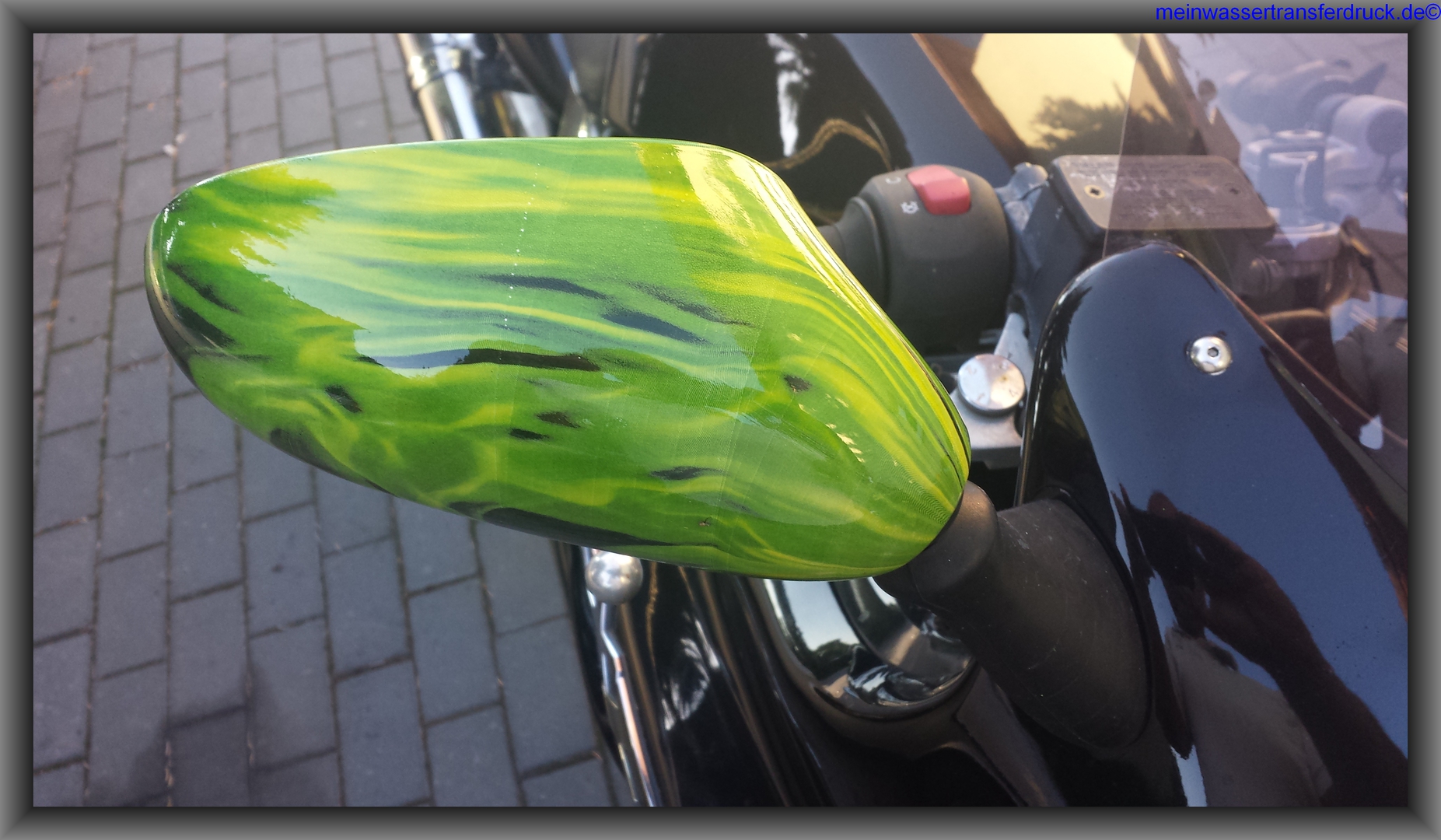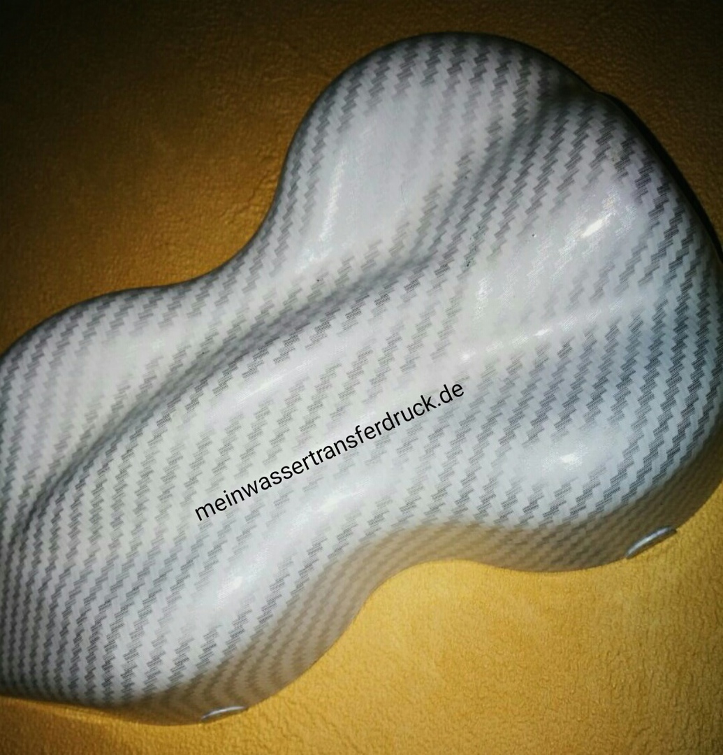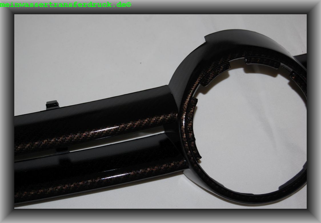 Das zu beschichtende Teil wird entsprechend vorbehandelt und mit einem Base-Coat entsprechend der ausgewählten Folie lackiert. Anschließend erfolgt der eigentliche Tauchvorgang. Hier wird die gewünschte Designfolie auf die Wasseroberfläche gelegt und nach einer definierten Zeit aktiviert, so dass dann anschließend Ihr Teil getaucht werden kann. Durch den Wasserdruck schmiegt sich der Dekorfilm gleichmäßig an das Teil. Nach dem Tauchvorgang wird es einer gründlichen Spülung unterzogen, so dass alle Folienreste entfernt sind. Nach einer Trocknungszeit bekommt Ihr Teil die Finishpolitur. Es wird in mehreren Schichten mit einem 2K-Klarlack lackiert und somit ist es geschützt und erstrahlt in Hochglanz in Ihrem neuen Design.