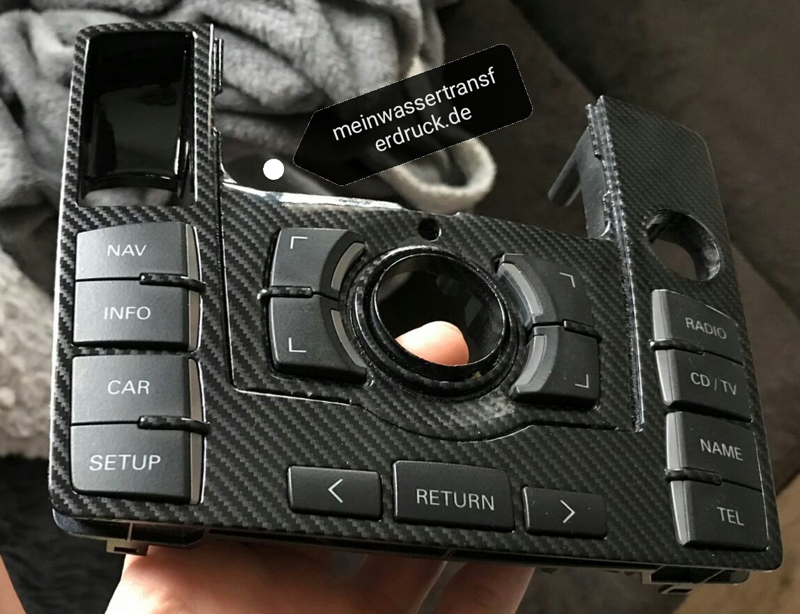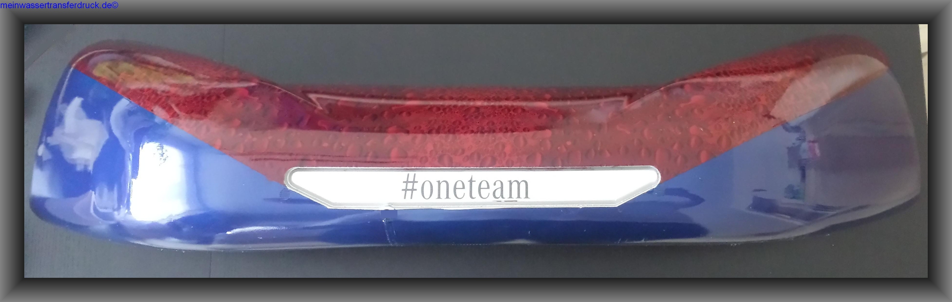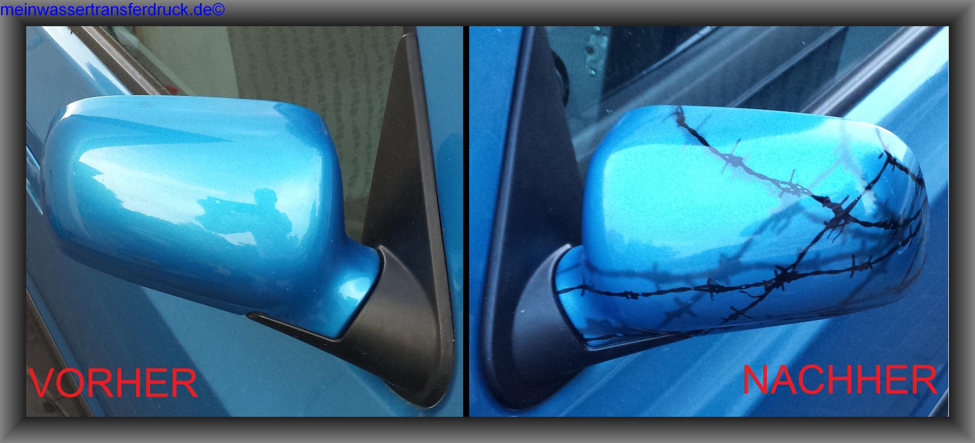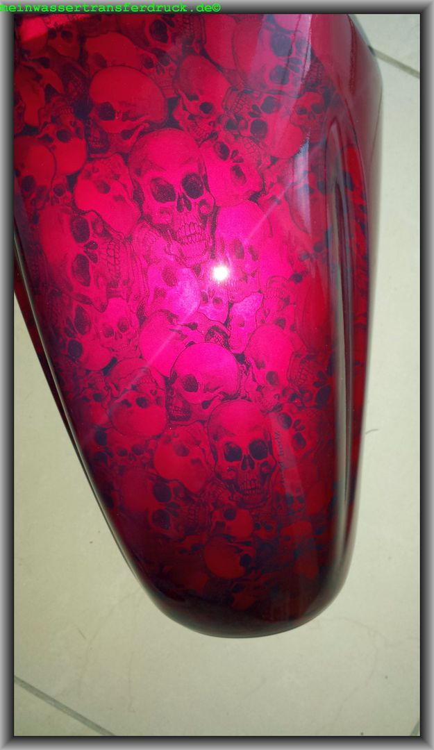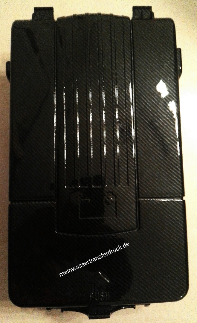 Das zu beschichtende Teil wird entsprechend vorbehandelt und mit einem Base-Coat entsprechend der ausgewählten Folie lackiert. Anschließend erfolgt der eigentliche Tauchvorgang. Hier wird die gewünschte Designfolie auf die Wasseroberfläche gelegt und nach einer definierten Zeit aktiviert, so dass dann anschließend Ihr Teil getaucht werden kann. Durch den Wasserdruck schmiegt sich der Dekorfilm gleichmäßig an das Teil. Nach dem Tauchvorgang wird es einer gründlichen Spülung unterzogen, so dass alle Folienreste entfernt sind. Nach einer Trocknungszeit bekommt Ihr Teil die Finishpolitur. Es wird in mehreren Schichten mit einem 2K-Klarlack lackiert und somit ist es geschützt und erstrahlt in Hochglanz in Ihrem neuen Design.